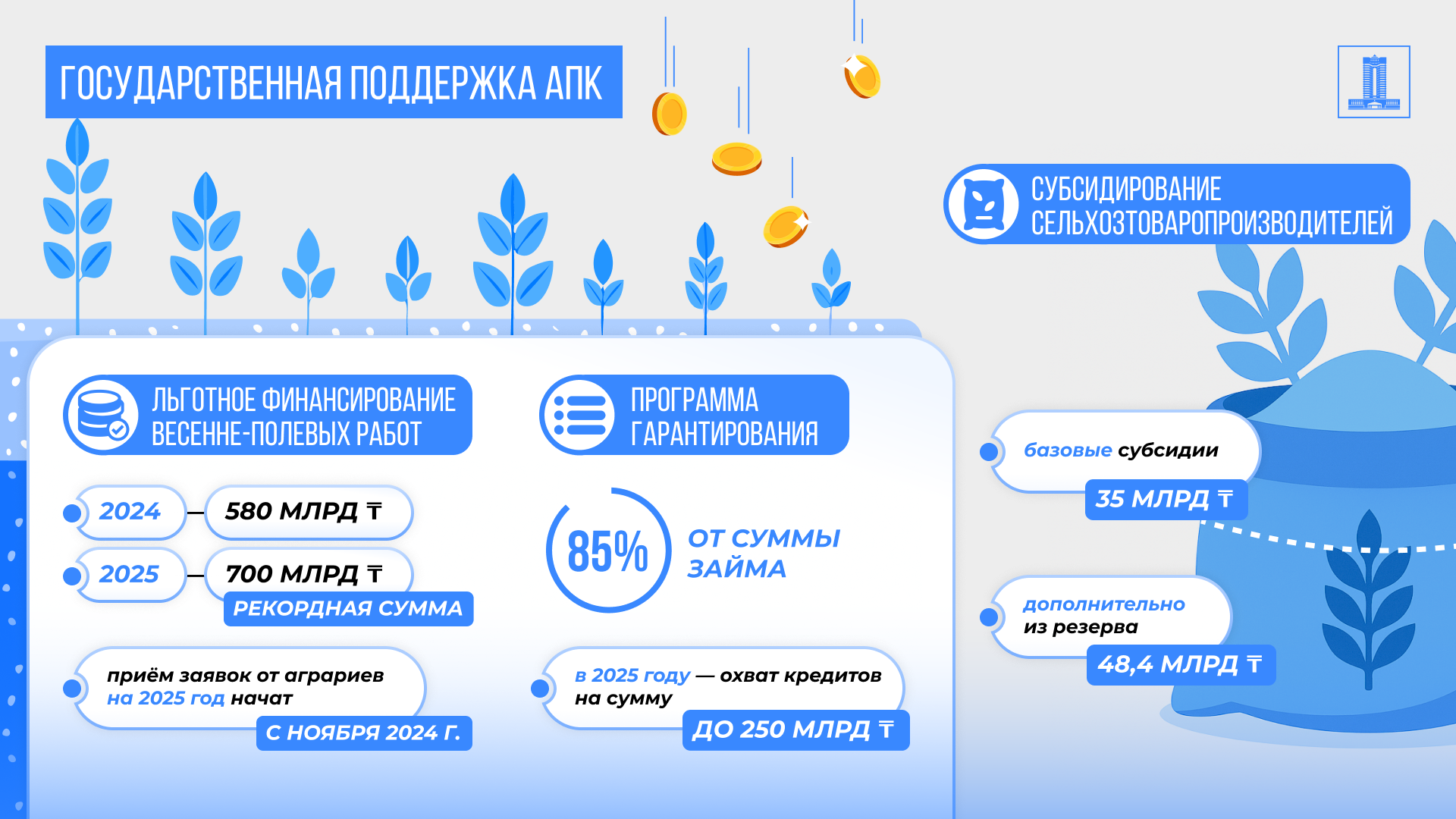 - увеличен объем льготного финансирования посевной кампании до 580 млрд тенге в прошлом году и до рекордных 700 млрд тенге в нынешнем с заблаговременным запуском кредитования (ранее финансирование не превышало 140 млрд тенге). Впервые внедрена специальная программа гарантирования до 85% от суммы займа на ВПР;