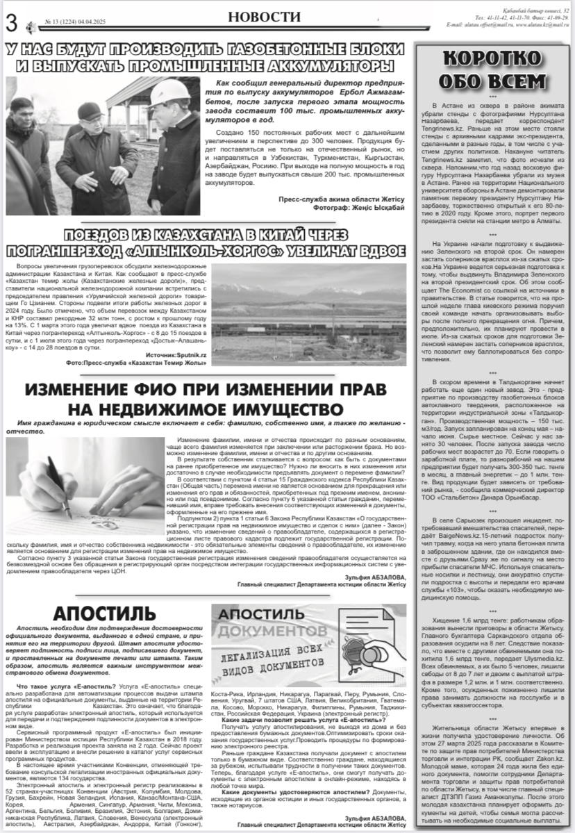 04.04.2025 года в общественно-политической газете «Алатау» №13 (1224) опубликована статья главного специалиста отдела регистрации некоммерческих организаций и контроля в сфере регистрационной службы Департамента юстиции области Жетісу Абзаловой Зульфии Закировны на тему «Апостиль».