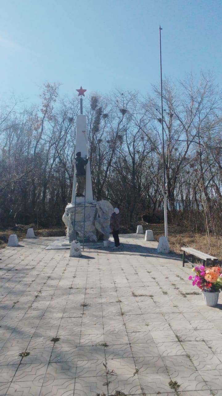 Благоустройство Памятника участникам ВОв в с.Буденное. Произведена покраска, побелка обелиска, убрана сухая рстительность, убраны сухие ветки.