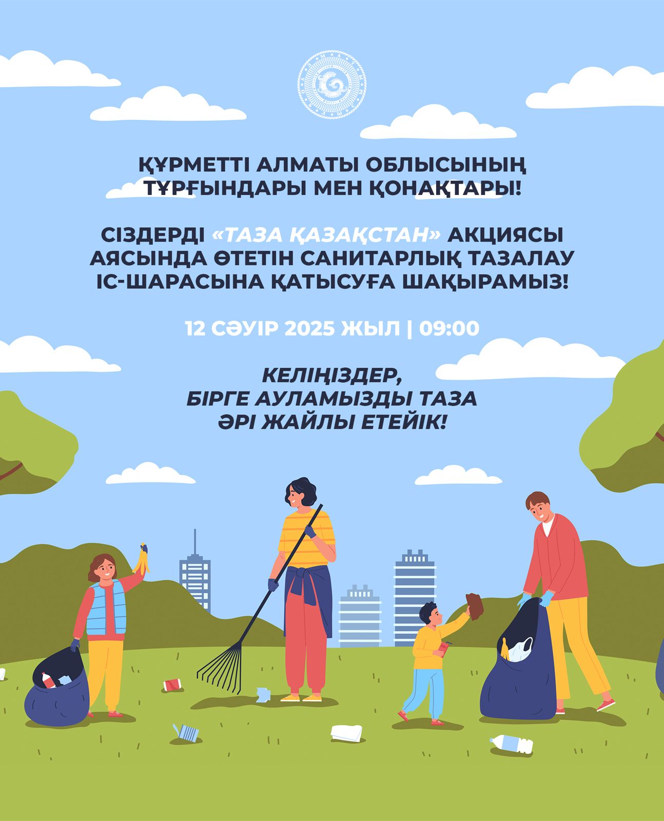 В рамках акции «Таза Қазақстан» проводится субботник с целью улучшения экологической обстановки нашего города (или села) и поддержания чистоты окружающей среды. Приглашаем всех принять активное участие в этом благом деле!