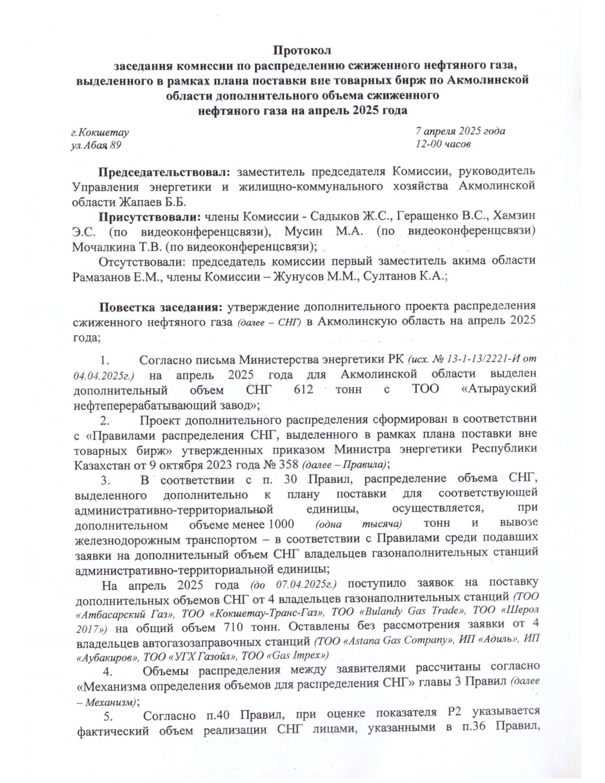 бирж по Акмолинской области дополнительного объема сжиженного нефтяного газа на апрель 2025 года. Утвержденный проект распределения направлен на заводы-производителей и Министерство энергетики Республики Казахстан. Копии протокола заседания,