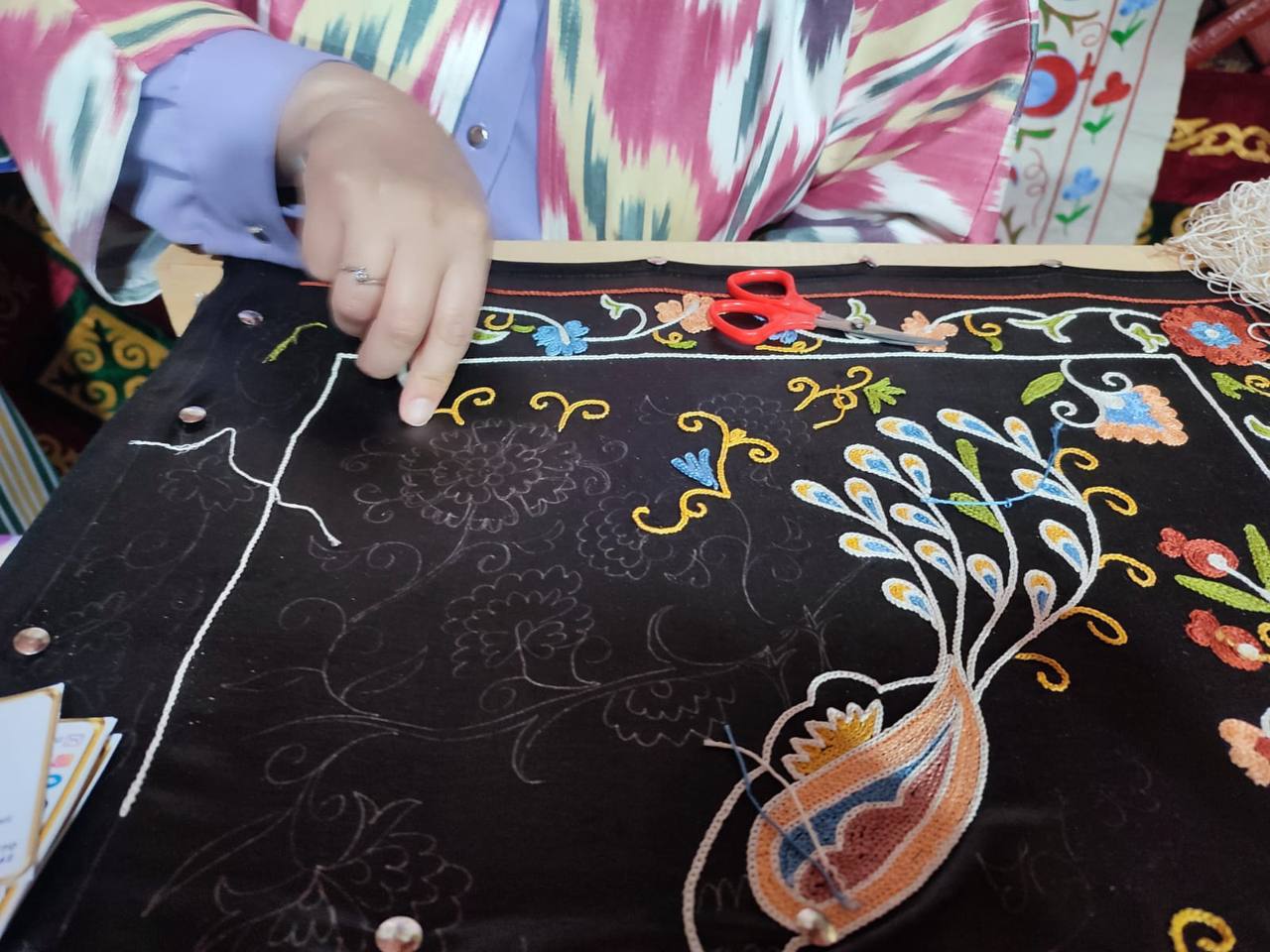 «Чтобы вышить небольшую наволочку, уходит несколько дней, на чапан требуется примерно месяц, а на покрывало или скатерть – около двух месяцев. Меня научила этому искусству моя бабушка, а мама занималась керамикой. Сейчас мы работаем с мужем», – отмечает Насиба Исхакова.