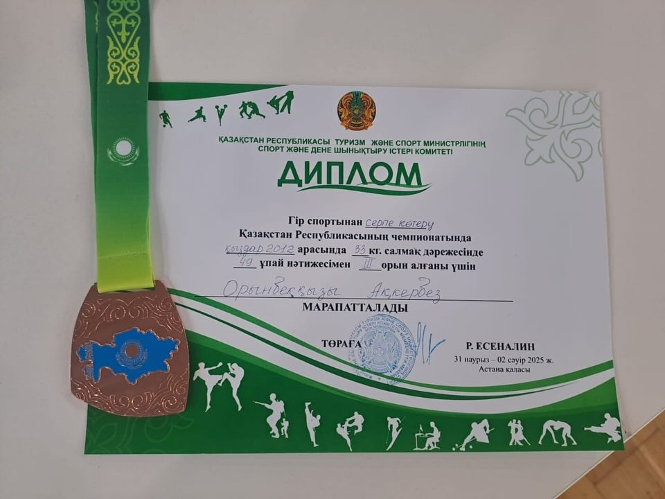С 31 марта по 02 апреля текущего года на чемпионате Республики Казахстан по гиревому спорту среди молодежи и юниоров в г. Астане ученица КГУ “Центр массовых и национальных спортивных игр” Аккербез Орынбековна заняла призовое 3 место .Ученица села Тана Мырза.