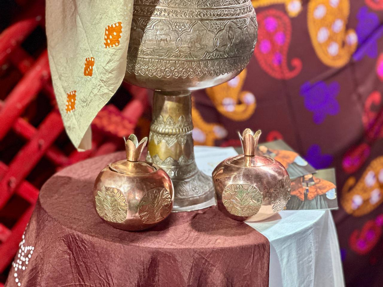– На медной посуде, коврах, шелковых платьях, тачалдуз мы всегда используем орнамент – бута. У этого узора очень много значении. Это символ огня, пламени. Даже его расположение имеет значение. Если все бута стоят один за другим, это означает силу армию. Если две бута расположены лицом к лицу, то это означает любовь. У нашего народа крепкие семейные традиции. И, обычно для домашней посуды мы используем бута разного размера, большой узор символизирует мужчину, поменьше – женщину, а совсем маленький – ребенка. Очень популярным в искусстве является восьмигранный узор. Его изображение имеет политическое значение. Звезда на нашем флаге восьмигранная и мы гордимся своей страной. Часто используем в узорах рисунок граната, который также упоминается в Коране, – рассказывает Назар Алиев.