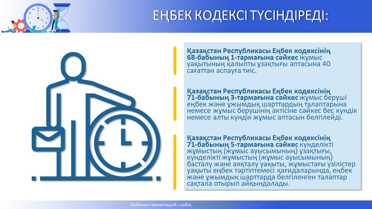 НОРМАЛЬНАЯ ПРОДОЛЖИТЕЛЬНОСТЬ ВАШЕГО РАБОЧЕГО ВРЕМЕНИ РЕГУЛИРУЕТСЯ В СООТВЕТСТВИИ С ЗАКОНОДАТЕЛЬСТВОМ, ПРЕДУСМОТРЕННЫМ ТРУДОВЫМ КОДЕКСОМ РК.