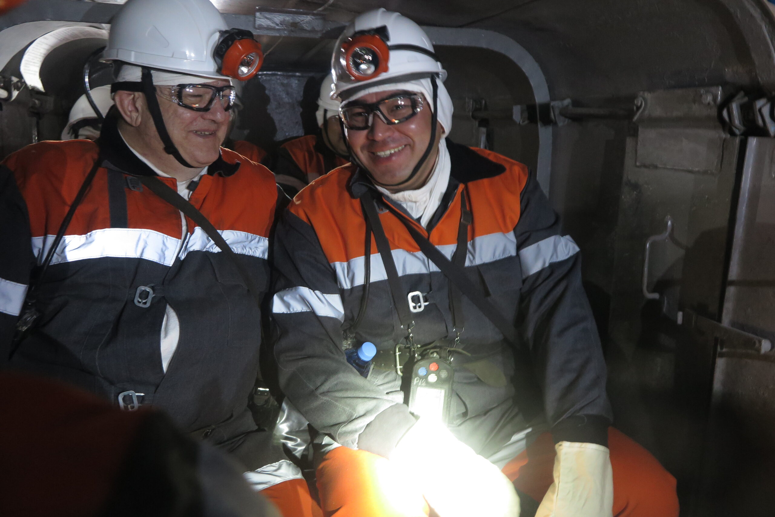 Чингис Аринов спустился в шахту «Саранская», где на горизонте минус 540 метров осмотрел работу добычного комбайна на пласте, а также ознакомился с условиями труда шахтёров.