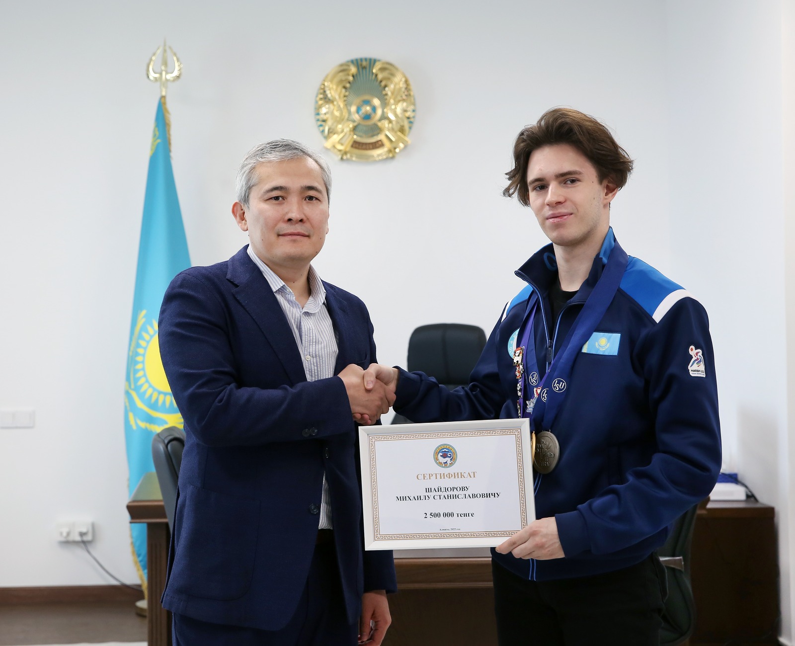 В акимате города спортсмена поздравил заместитель акима Алматы Бейбут Шаханов, вручив денежный сертификат на 2,5 млн тенге.