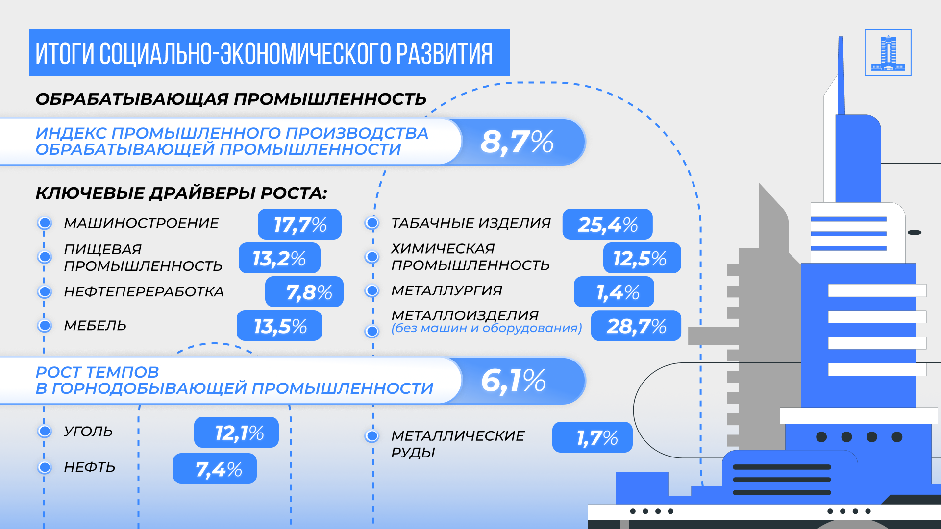В строительной отрасли по итогам квартала показатель роста достиг 16,9%. Доложено об увеличении объемов работ по строительству школ, автомобильных дорог, железнодорожных линий, инженерной инфраструктуры.