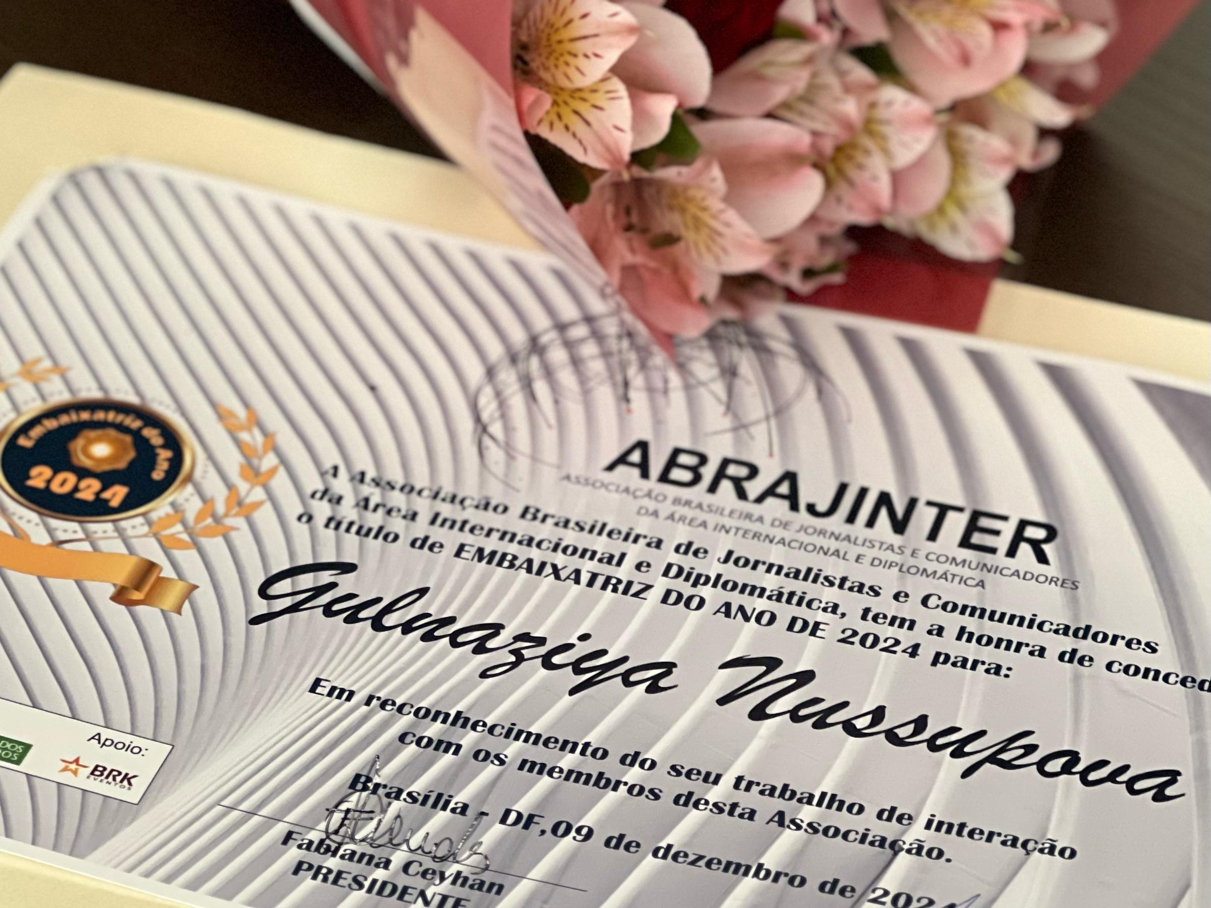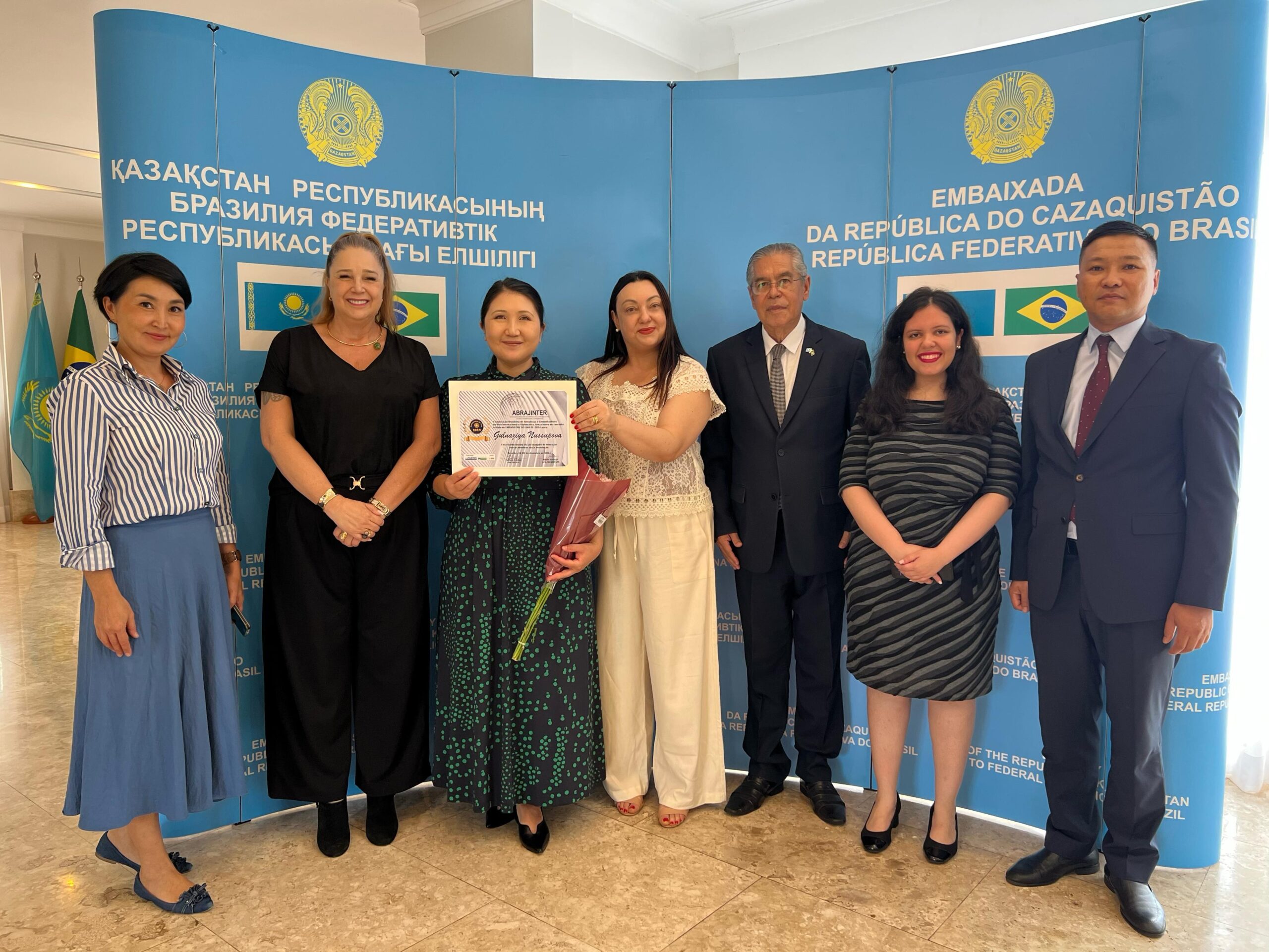 Бразилиа, 14 апреля 2025 года – в Посольстве Казахстана в Бразилии состоялось церемония вручения почетной грамоты президенту Ассоциации супруг руководителей дипломатических миссий, аккредитованных в Бразилии (GCCM), супруге Посла Казахстана в Бразилии Гульназие Нусуповой от Ассоциации журналистов Бразилии «ABRAJINTER» в категории «Супруга Посла года».