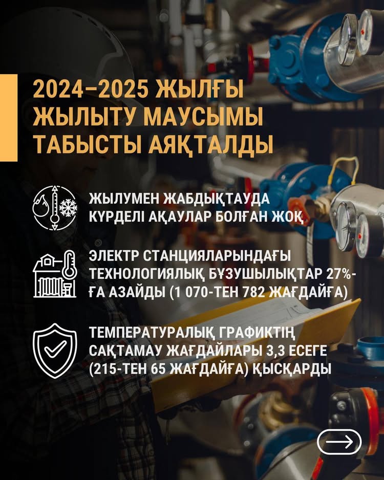 Осенне-зимний сезон по теплоснабжению 2024-2025 года прошел без серьезных дефектов, что свидетельствует о результативности принятых Правительством Казахстана мер.