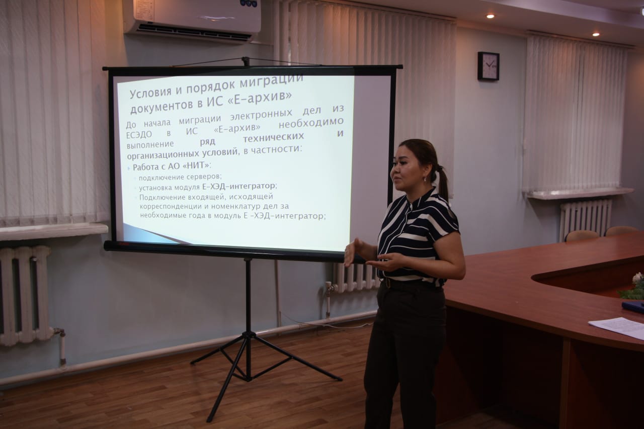 Руководитель отдела архивной работы Ж.Ж. Жантлесова в практической части семинара представила пошаговый алгоритм миграции электронных документов из ЕСЭДО в ИС «Е-Архив», а также разъяснила основные функции и задачи модулей системы, включая порядок подготовки и передачи дел, проведения экспертизы ценности и согласования с экспертной комиссией.