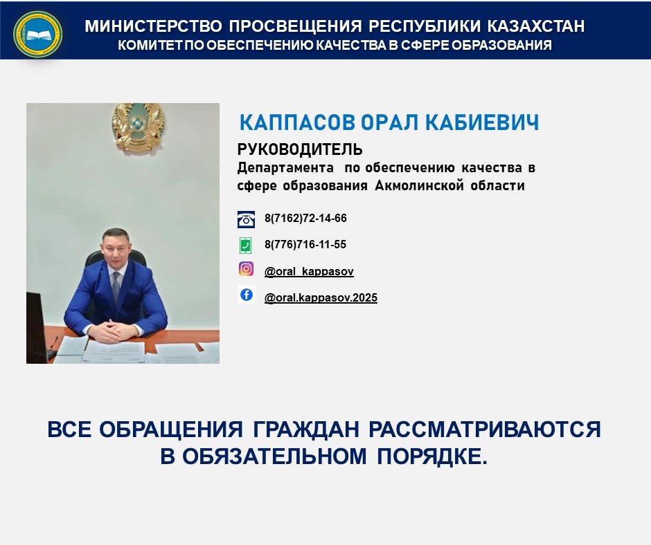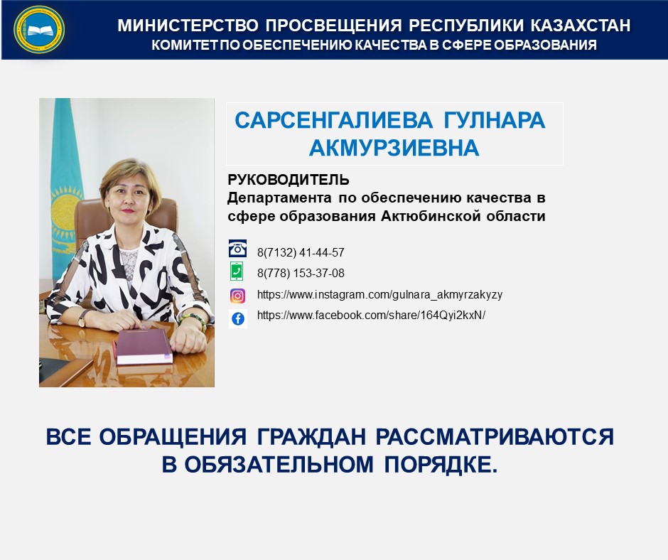 В целях повышения открытости и эффективности обратной связи с населением Комитет по обеспечению качества в сфере образования опубликовал мобильные и рабочие номера телефонов руководителей территориальных департаментов. Также доступны их аккаунты в социальных сетях.