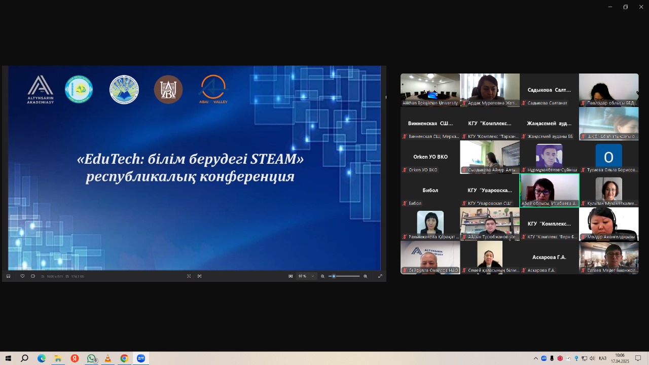Методический центр области Жетісу, Национальная академия образования им. ЫАлтынсарина, отделы образования и методические центры Абайской, Павлодарской и Восточно-Казахстанской областей, некоммерческая организация «Красноярский детский технопарк «Кванториум» Российской Федерации и технологический кластер «Abai IT-Valley» Университета имени Алихана Бокейхана провели республиканскую онлайн-конференцию «EduTech: білім берудегі STEAM».