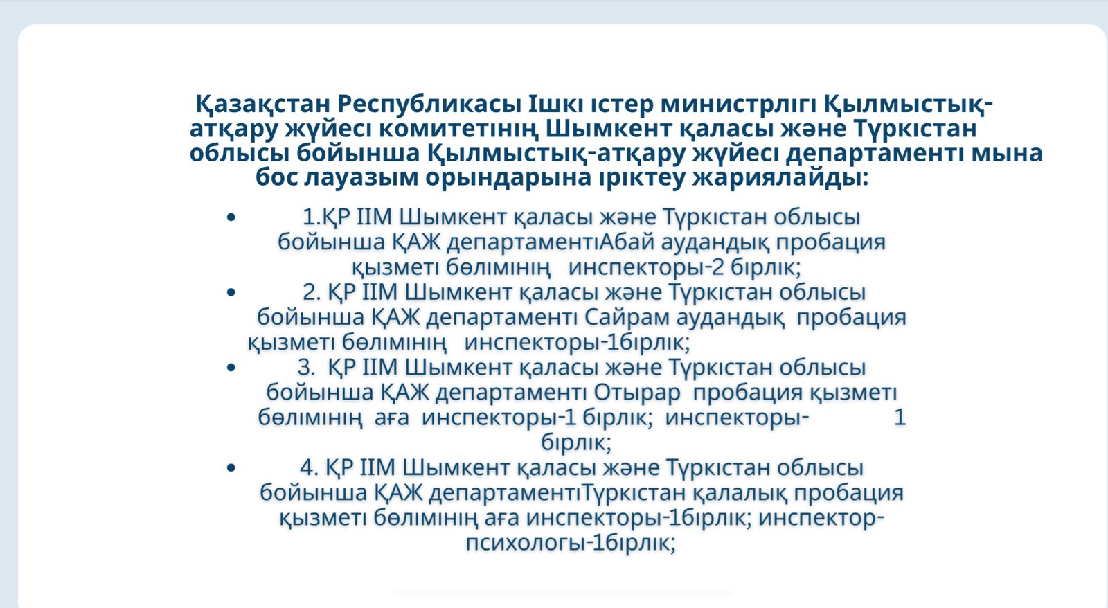 1.ҚР ІІМ Шымкент қаласы және Түркістан облысы бойынша ҚАЖ департаменті  Абай аудандық  пробация қызметі бөлімінің    инспекторы-2 бірлік;                                                                                                                                             2.  ҚР ІІМ Шымкент қаласы және Түркістан облысы бойынша ҚАЖ департаменті Сайрам аудандық  пробация қызметі бөлімінің    инспекторы-1бірлік;