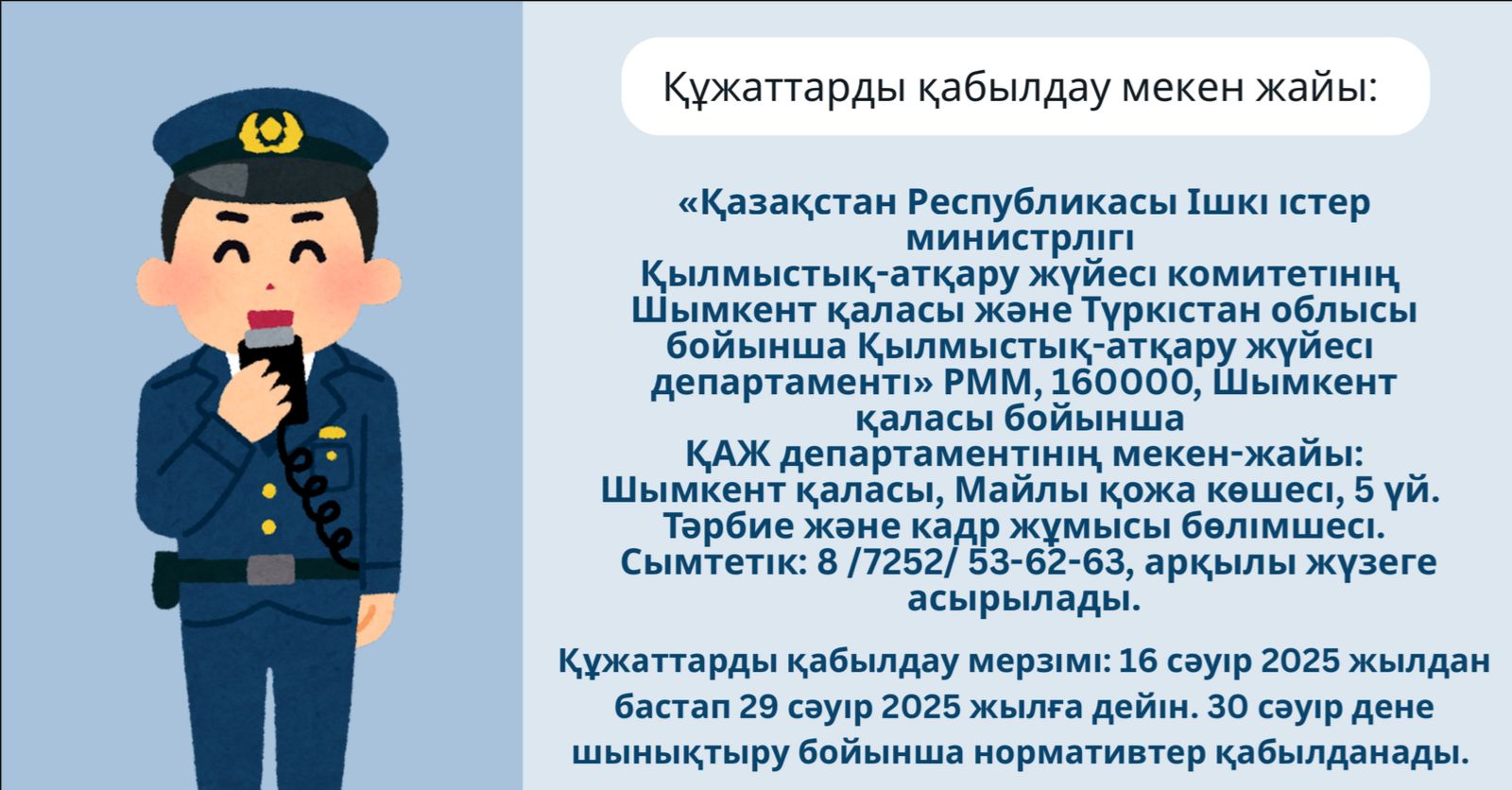 Құжаттарды қабылдау мекен жайы: «Қазақстан Республикасы Ішкі істер министрлігі Қылмыстық-атқару жүйесі комитетінің Шымкент қаласы және Түркістан облысы бойынша Қылмыстық-атқару жүйесі департаменті» РММ, 160000, Шымкент қаласы бойынша ҚАЖ департаментінің мекен-жайы: Шымкент қаласы, Майлы қожа көшесі, 5 үй. Тәрбие және кадр жұмысы бөлімшесі. Сымтетік: 8 /7252/ 53-62-63,  арқылы жүзеге асырылады.