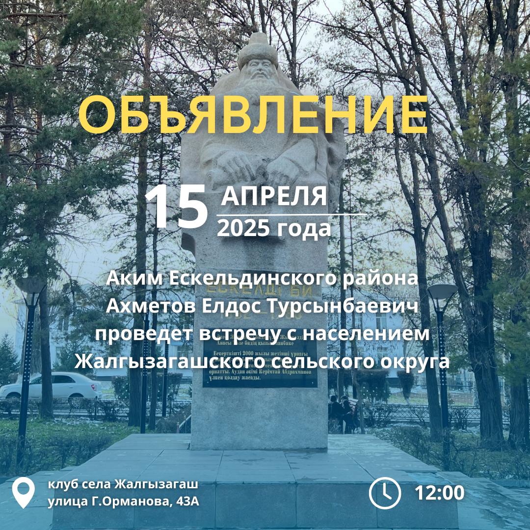 15 апреля 2025 года состоится встреча акима Ескельдинского района Елдоса Ахметова с жителями Жалгизагашского сельского округа.