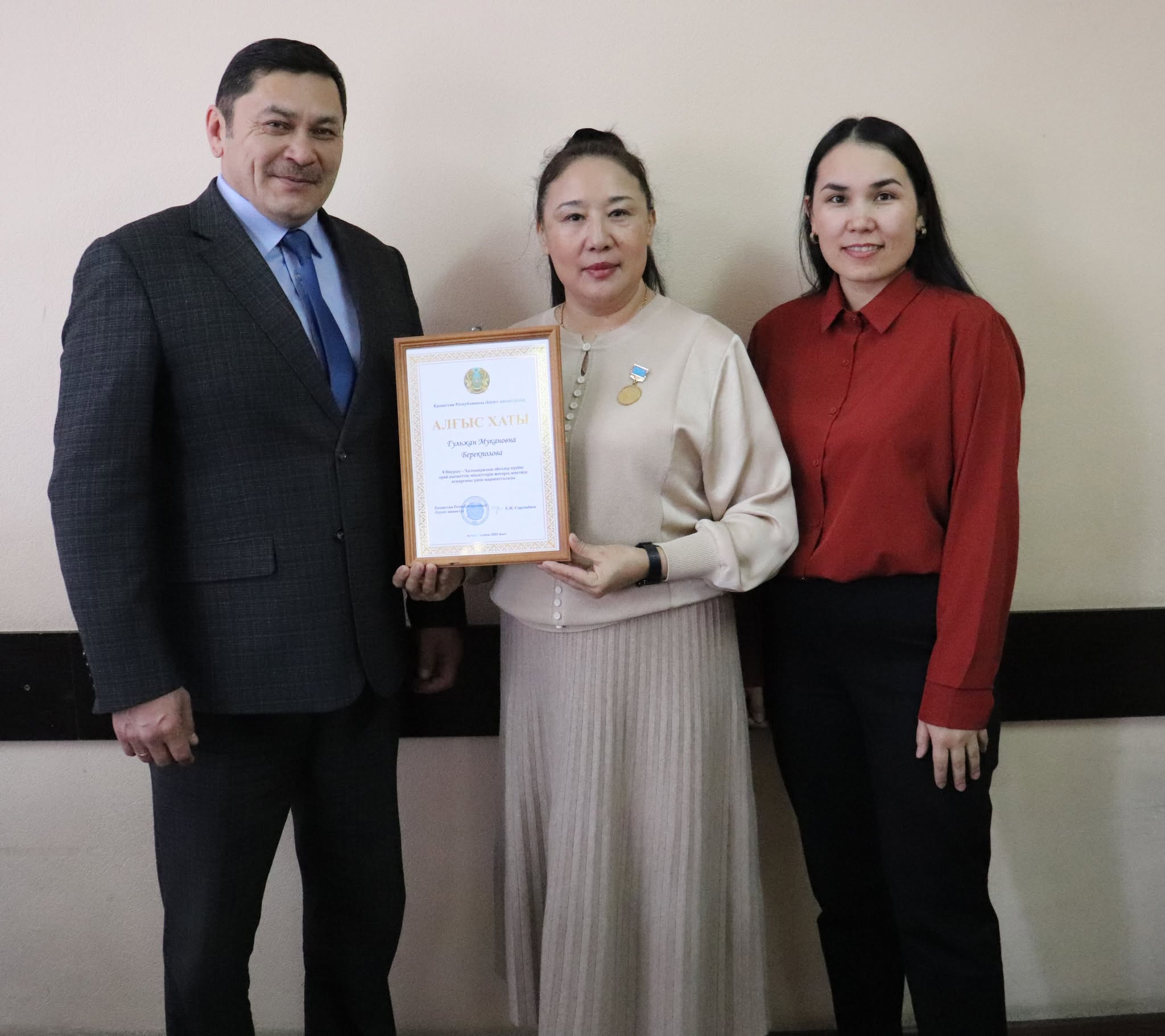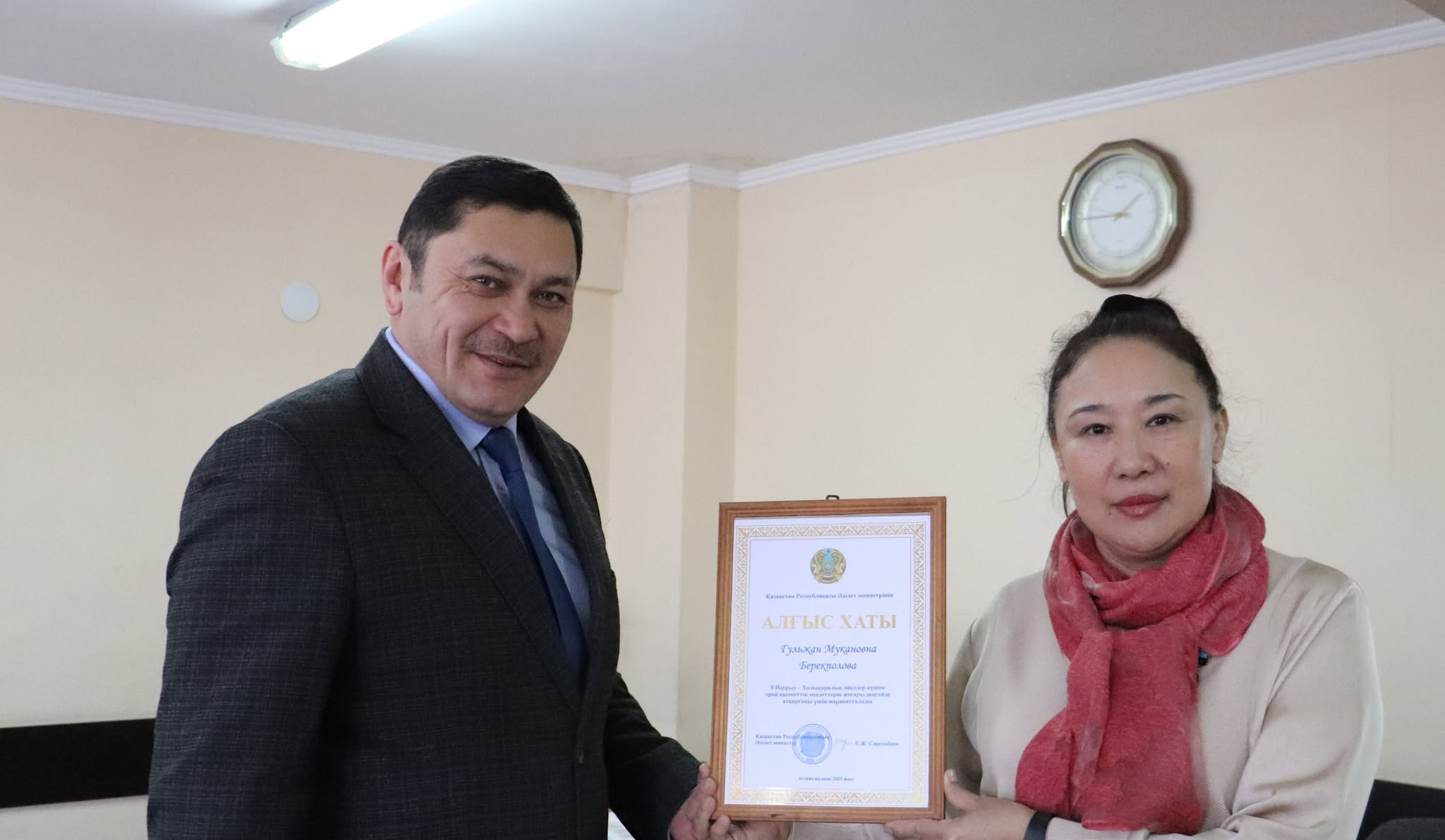 Қазақстан Республикасының Әділет министрі Е.Ж. Сәрсембаевтың атынан Шығыс Қазақстан облысы бойынша заң консультанттары палатасының мүшесі Г. Берекполоваға қызметтік міндеттерін жоғары деңгейде атқарғаны үшін алғыс хаты Шығыс Қазақстан облысының Әділет департаментінің басшысының м.а. А.Амирхановпен табысталды.