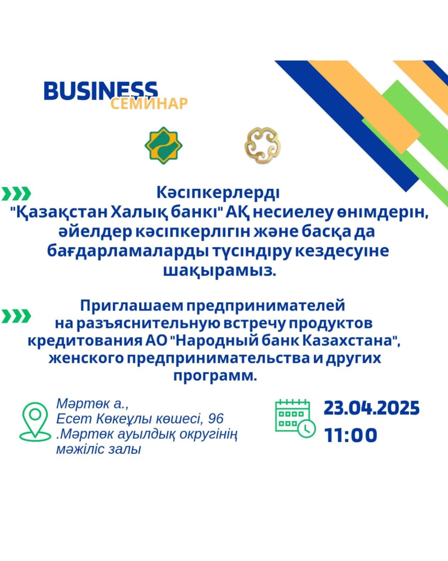 Приглашаем вас на разъяснительную встречу АО “Народный банк Казахстана” по вопросам кредитных продуктов, поддержки женского предпринимательства и других программ.
