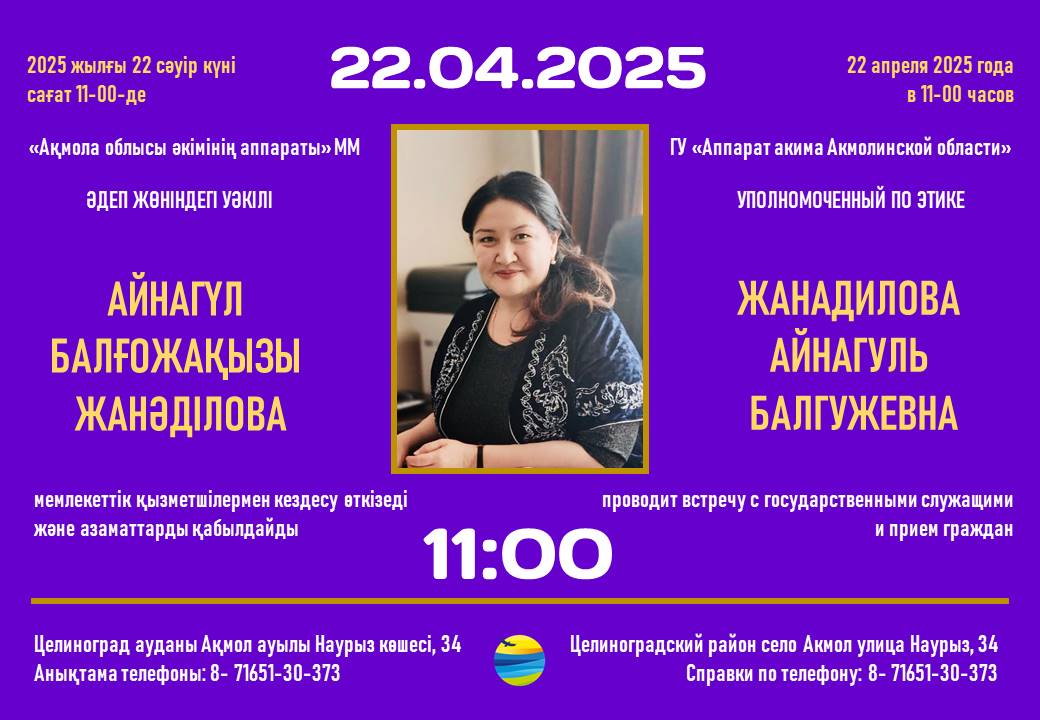 Уполномоченный по этике Аппарата акима Акмолинской области Жанадилова Айнагуль Балгужевна проводит встречу с государственными служащими и прием граждан 22 апреля 2025 года в 11-00 часов.