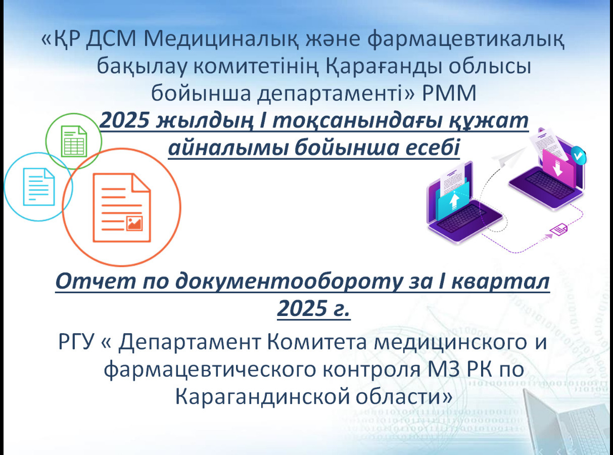 14 апреля 2025 года РГУ «Департамент Комитета медицинского и фармацевтического контроля Министерства здравоохранения Республики Казахстан по Карагандинской области» во исполнение приказа руководителя аппарата Министерства здравоохранения Республики Казахстан от 20 ноября 2023 года №685 «Об утверждении Плана действий по реализации Концепции развития языковой политики в Республике Казахстан на 2023-2029 годы в системе здравоохранения на 2023-2029 годы» проведен анализ документооборота Департамента за I квартал 2025 г. В ходе совещания обсуждены проблемные вопросы, препятствующие достижению процента документооборота на государственном языке до 92% и пути их решения. Для обеспечения корректного перевода медицинских и фармацевтических терминов Департамент в своей работе использует специализированные словари и информационно-правовую систему нормативных правовых актов Республики Казахстан «Әділет».