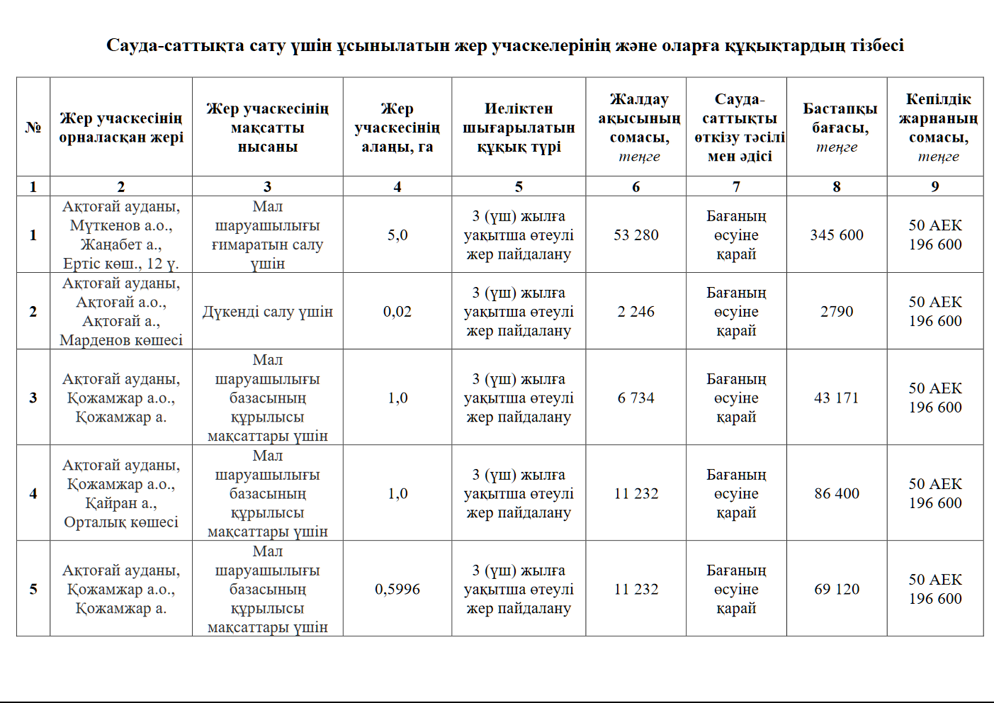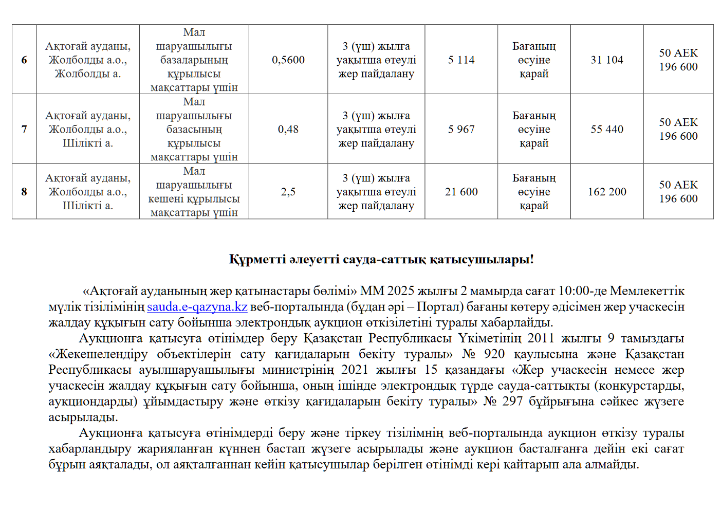 ГУ «Отдел земельных отношений Актогайского района» 2 мая 2025 года в 10:00 часов проводит электронный аукцион по продаже права аренды земельного участка методом повышения цены на Электронной торговой площадке sauda.e-qazyna.kz.