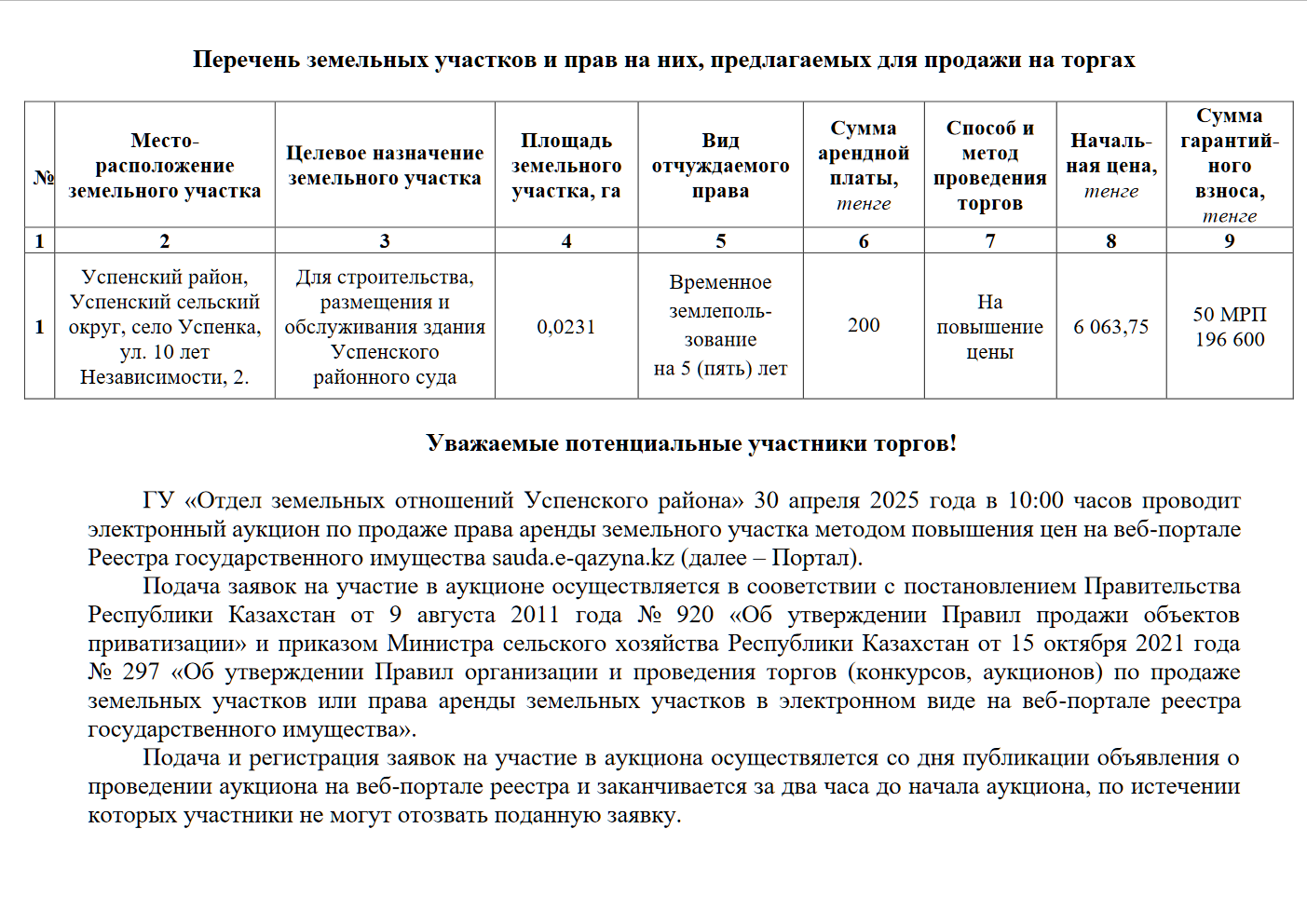 ГУ «Отдел земельных отношений Успенского района» 30 апреля 2025 года в 10:00 часов проводит электронный аукцион по продаже права аренды земельного участка методом повышения цены на Электронной торговой площадке sauda.e-qazyna.kz.