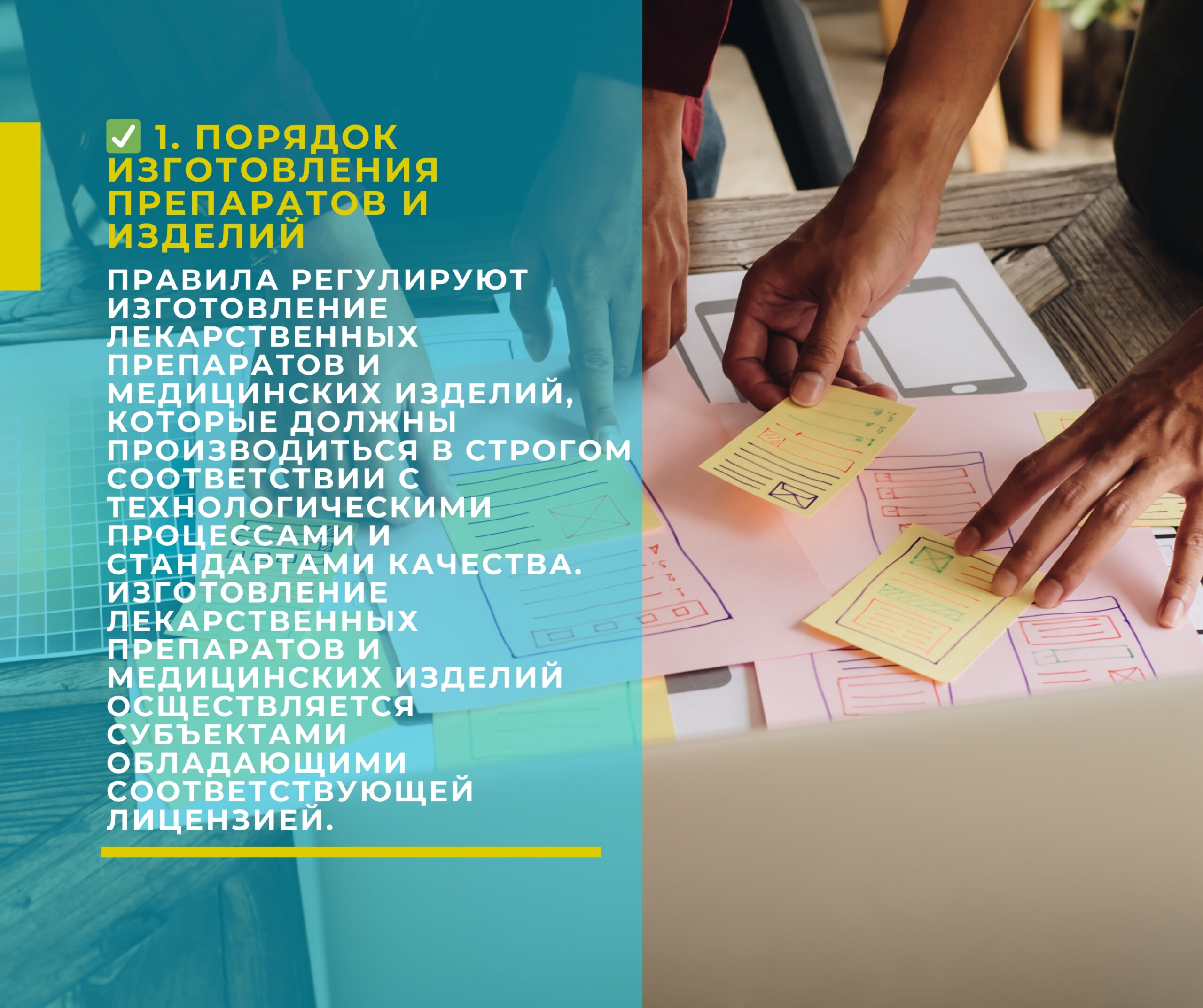 Правила регулируют изготовление лекарственных препаратов и медицинских изделий, которые должны производиться в строгом соответствии с технологическими процессами и стандартами качества. Изготовление лекарственных препаратов и медицинских изделий осществляется субъектами обладающими соответствующей лицензией.