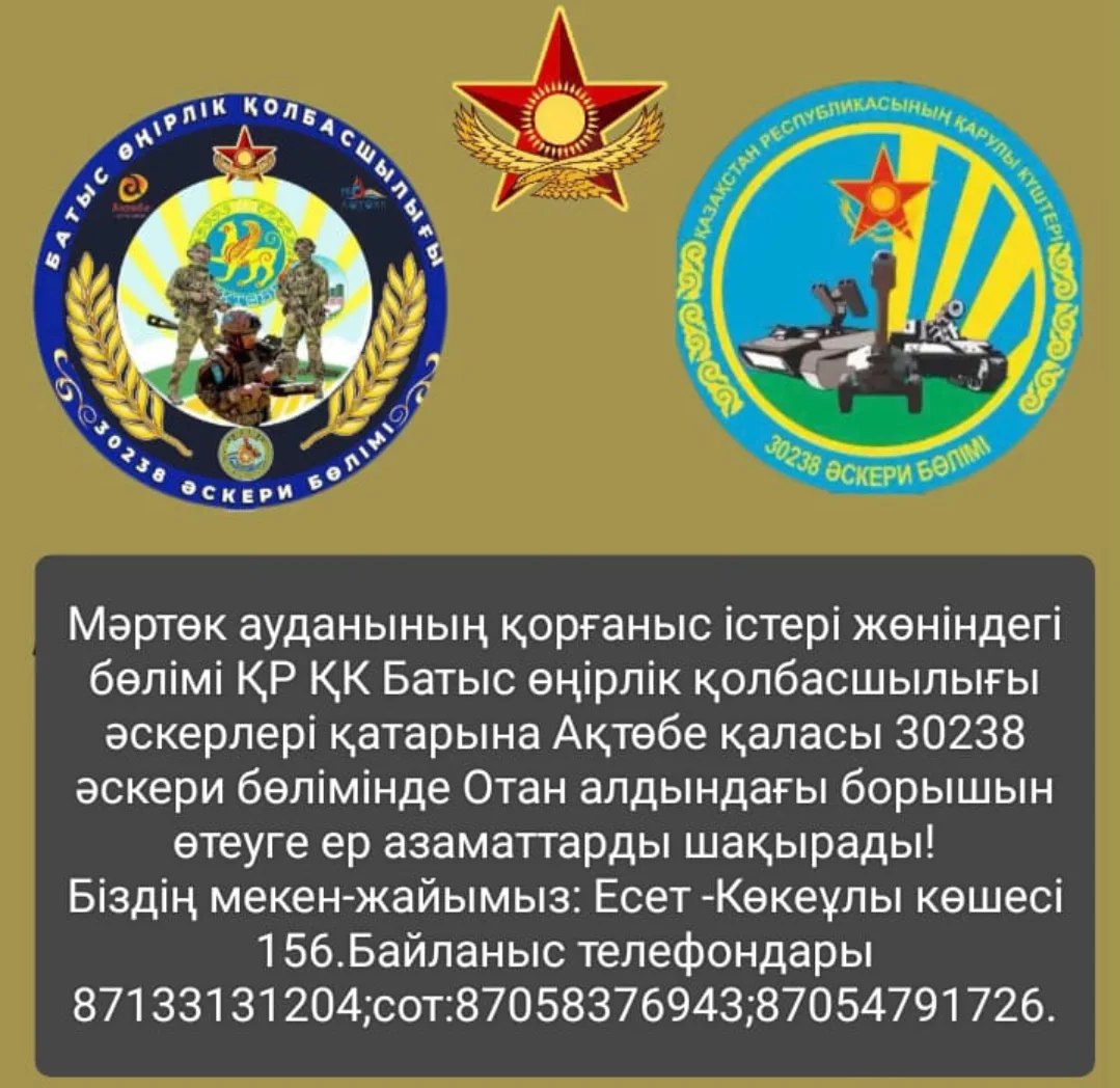 Мәртөк ауданының корғаныс істері жөніндегі бөлімі ҚР ҚК Батыс өңірлік қолбасшылығы әскерлері қатарына Ақтөбе қаласы 30238 әскери бөлімінде Отан алдындағы борышын өтеуге ер азаматтарды шақырады!