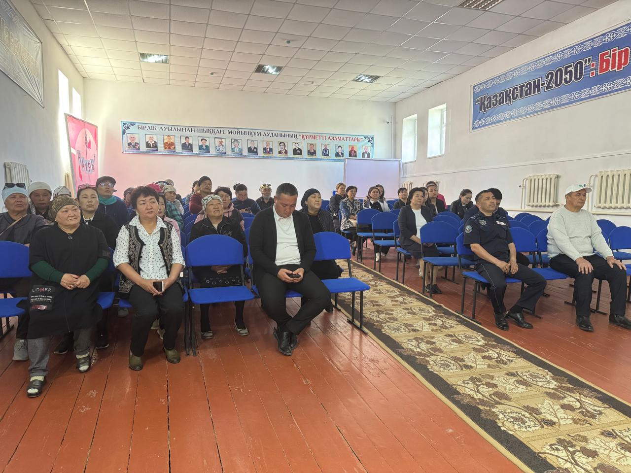 Во встрече приняли участие заместитель акима Мойынкумского района Толеулиев Мейрхан Берикович, аким Кызылтальского сельского округа Айдаркулов Жанибек Танкашевич, участковый инспектор полиции и жители села.