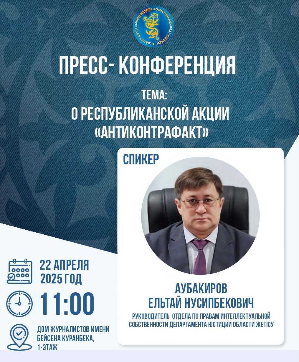 22.04.2025 года руководитель отдела по правам интеллектуальной собственности Департамента юстиции области Жетісу Аубакиров Ельтай Нусипбекович проведет пресс-конференцию о республиканской акции «Антиконтрафакт»