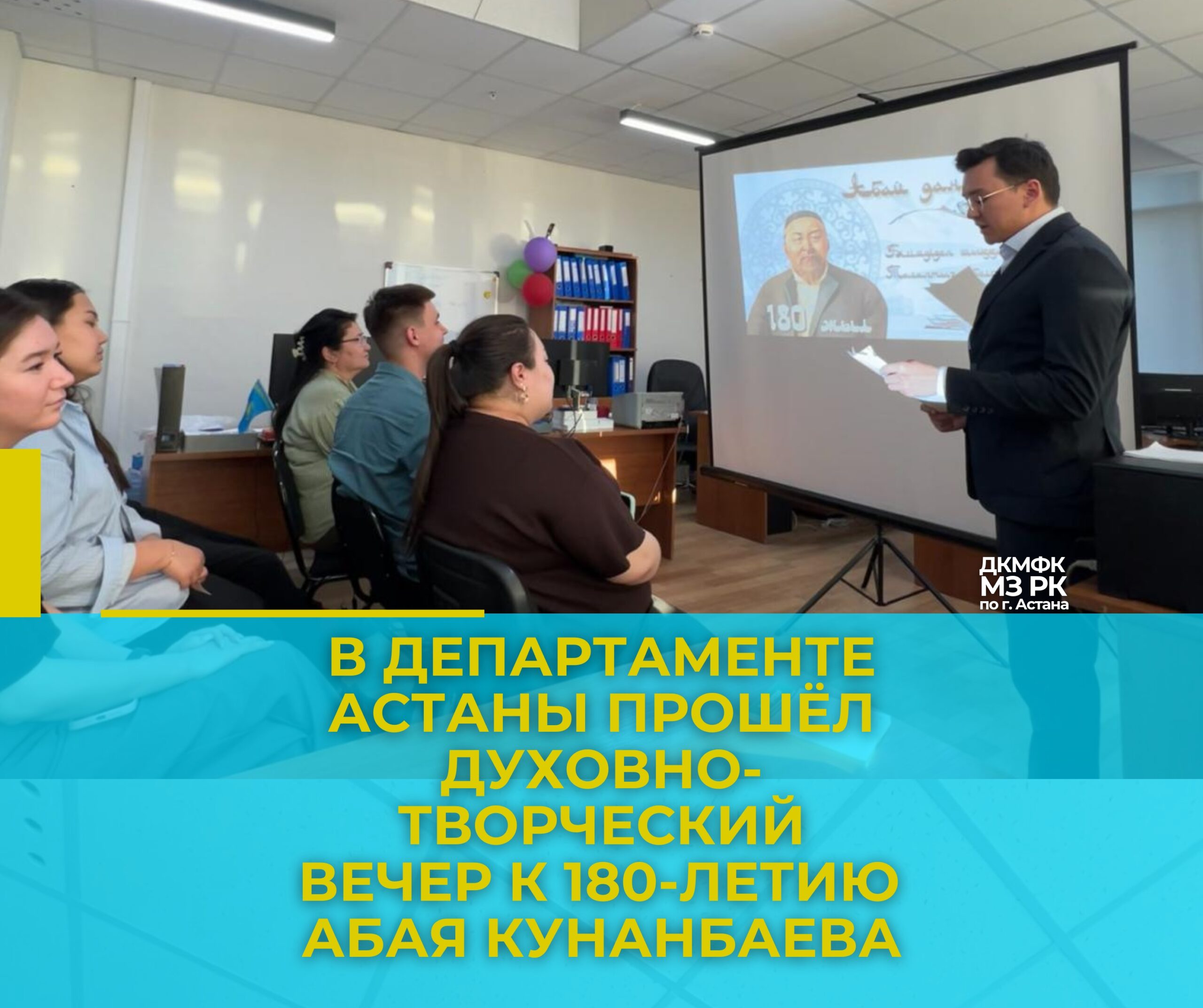 Депаратамент комитета медицинского и фармацевтического контроля Министерства здравоохранения Республики Казахстан по городу Астана города Астана организовал особенный творческий вечер в честь 180-летия великого поэта и мыслителя Абая Кунанбаевича. Этот вечер был направлен на популяризацию литературного наследия великого акына и повышение статуса государственного языка.