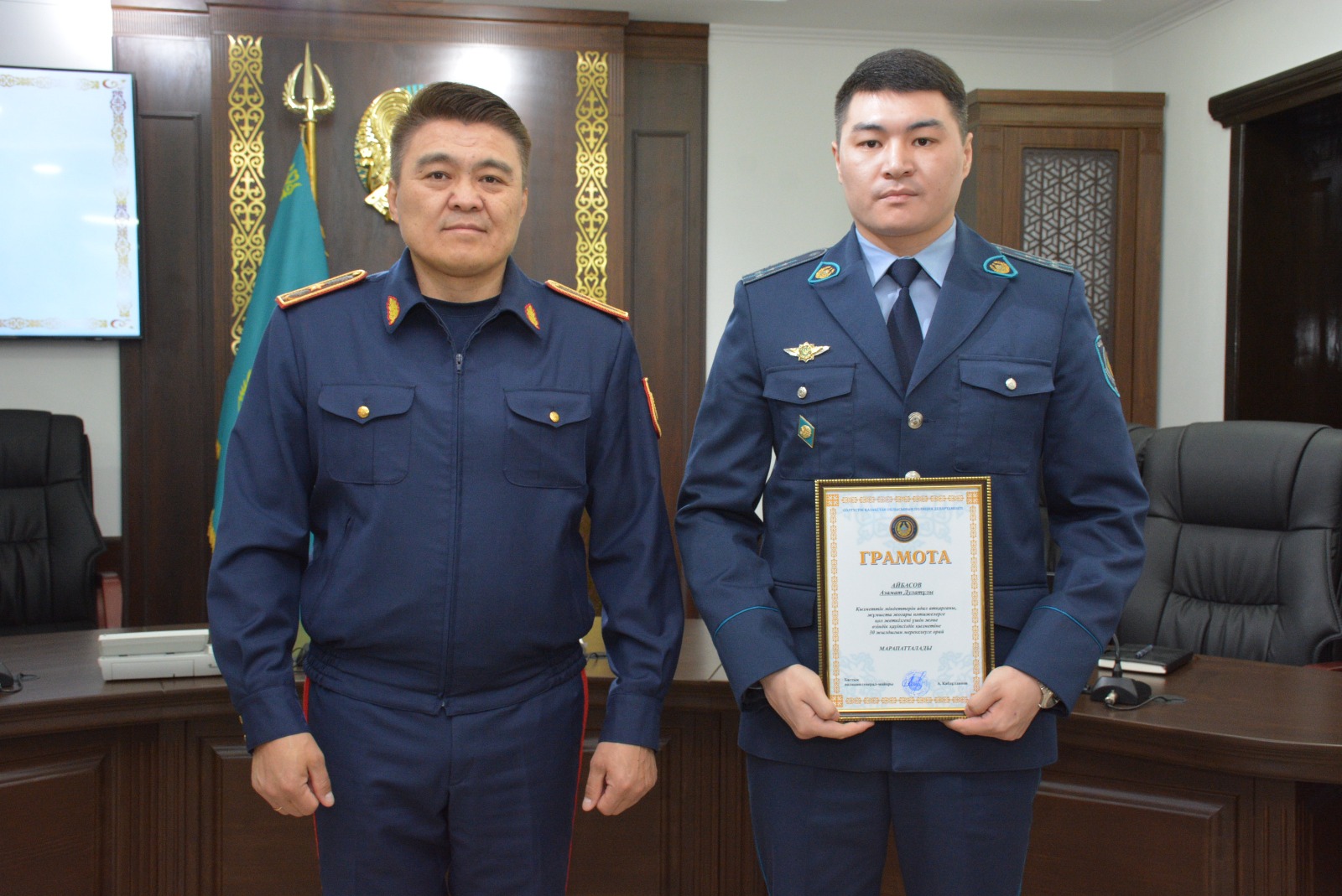 Также на собрании была зачитана поздравительная телеграмма министра внутренних дел РК генерал-лейтенанта полиции Ержана Саденова.