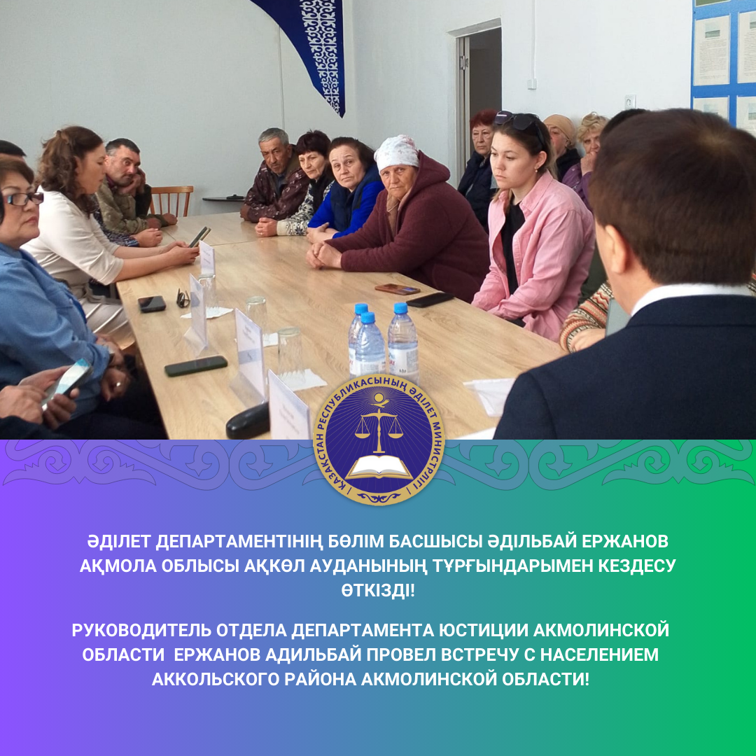 24 апреля 2025 года руководитель отдела Департамента юстиции Акмолинской области Ержанов Адильбай провел встречу с населением Аккольского района. Мероприятие состоялось в селе Урюпинка в здании дома культуры с участием представителей акимата, адвоката, нотариуса и судебных исполнителей.
