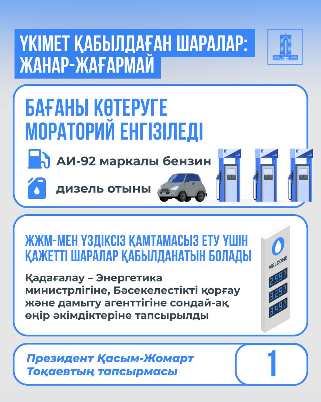 Премьер-министр поручил Министерству энергетики совместно с Агентством по защите и развитию конкуренции и акиматами регионов обеспечить контроль, а также принять меры по бесперебойному обеспечению внутреннего рынка ГСМ.