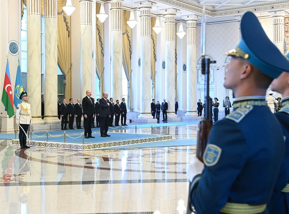 Касым-Жомарт Токаев и Ильхам Алиев представили друг другу членов официальных делегаций. Начальник почетного караула отдал приветственный рапорт главам государств. Были исполнены государственные гимны двух стран.