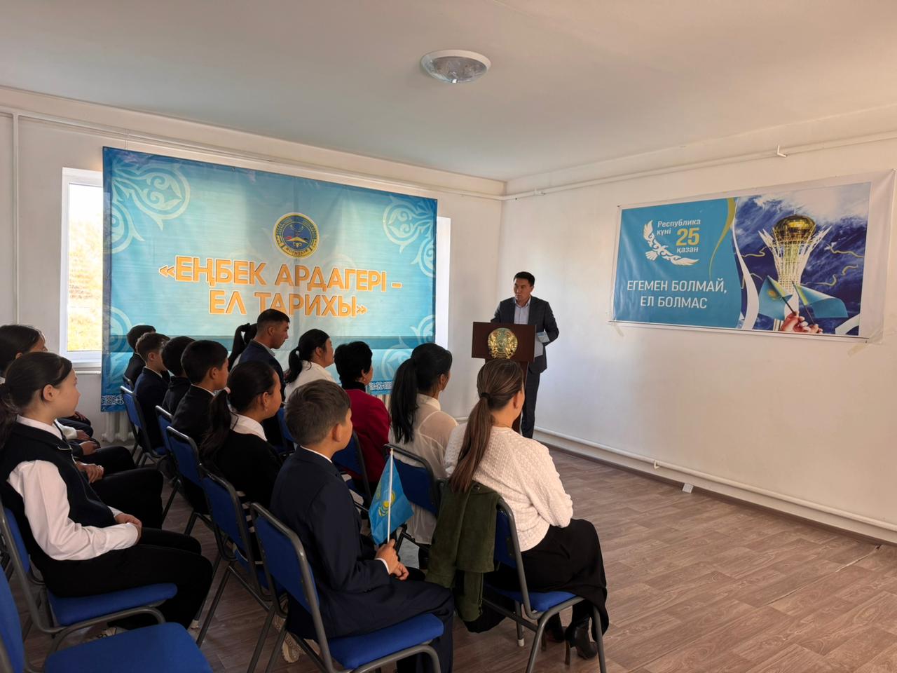 25 октября – в честь Дня Республики прошло праздничное мероприятие 25 октября – ко Дню Республики в сельской администрации было организовано торжественное собрание. Открыл мероприятие заведующий клубом Болат Жаксылыков, поздравил участников с праздником и представил небольшую праздничную программу. В ходе мероприятия с речью выступила сельская библиотекарь тетя Дарья, которая рассказала молодым людям о своих мыслях и исполнила музыкальную мелодию с домброй в качестве примерного момента. В завершение встречи аким села выступил с поздравительной речью, вручил сотрудникам специальные благодарственные письма и дал высокую оценку их труду. —