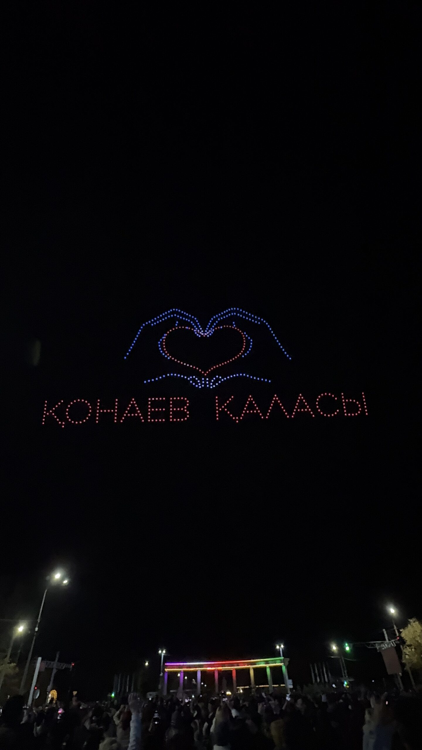 Главным моментом праздничной программы в Конаеве стало появление в небе строк Государственного гимна Казахстана — «Менің елім, менің елім, гүлің болып егілемін. Жырың болып төгілемін, елім! Туған жерім менің – Қазақстаным!». Сотни дронов создали в небе впечатляющую световую композицию, отразившую главные слова, ставшие священными для каждого казахстанца. В этот момент вся площадь объединилась в едином порыве — тысячи зрителей вместе с артистами исполнили гимн страны. Мощное звучание голосов, наполнившее пространство, стало кульминацией праздника и символом гордости, единства и любви к Родине.
