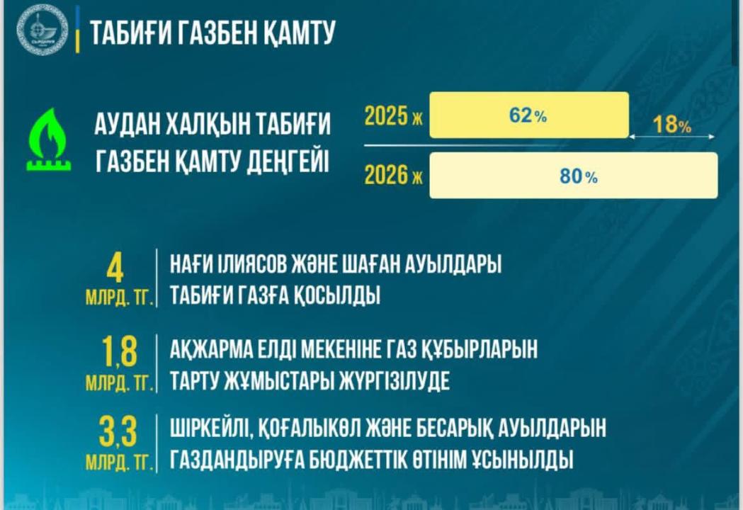 Работы по газификации населенных пунктов района также реализуются поэтапно. В прошлом году на эти цели было выделено 4 млрд тенге, и села Наги Ильясов и Шаган были подключены к природному газу.
