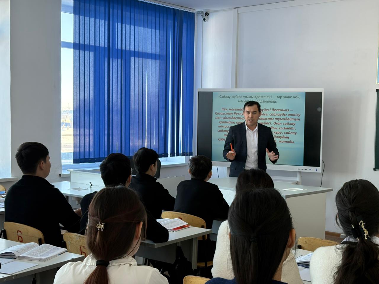 27.01.2026 года в преддверии» Всемирного дня выборов ” председатель участковой избирательной комиссии №145 Берик Муратович провел встречу с учащимися старших классов школы–гимназии имени Ы.Шорекова Миялинского сельского округа Кызылкогинского района о правах на выборы и избрание будущих избирателей. На вопросы учащихся о выборах Берик Муратович ответил.