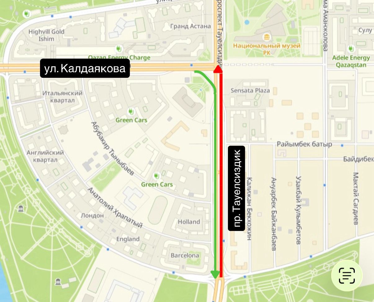 В связи с аварийно-восстановительными работами на пересечении проспекта Тәуелсіздік и улицы Ш. Калдаякова движение по проспекту Тәуелсіздік временно (на 1,5-2 суток) закрывается.