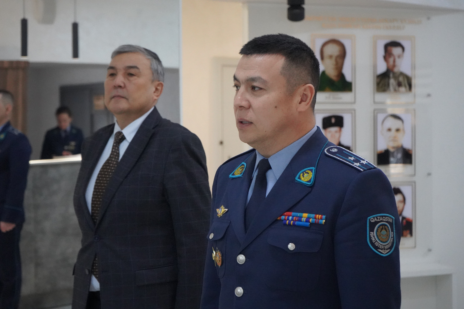 Полковник полиции Жусупов и председатель совета ветеранов ДП СКО и Национальной гвардии Акан Сыздыков поздравили сотрудников, пожелали дальнейшей безупречной службы на страже Закона и Порядка.