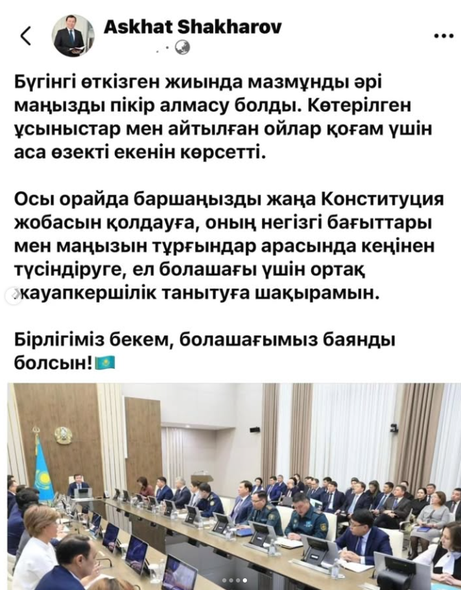 Аким Актюбинской области Асхат Шахаров опубликовал на своей странице в социальной сети Facebook пост, посвящённый активному собранию по обсуждению работы Конституционной комиссии и проекта новой Конституции.