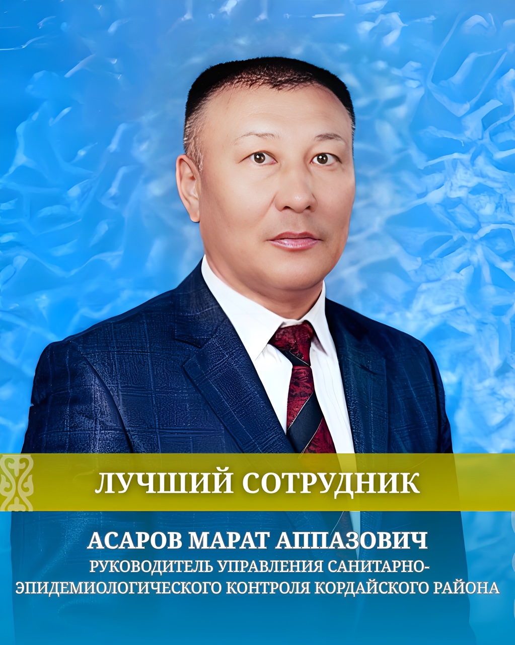 Асаров Марат Аппазович – руководитель управления санитарно-эпидемиологического контроля Кордайского района. Он родился 21 июня 1968 года в селе Жалагаш Жалагашского района Кызылординской области.