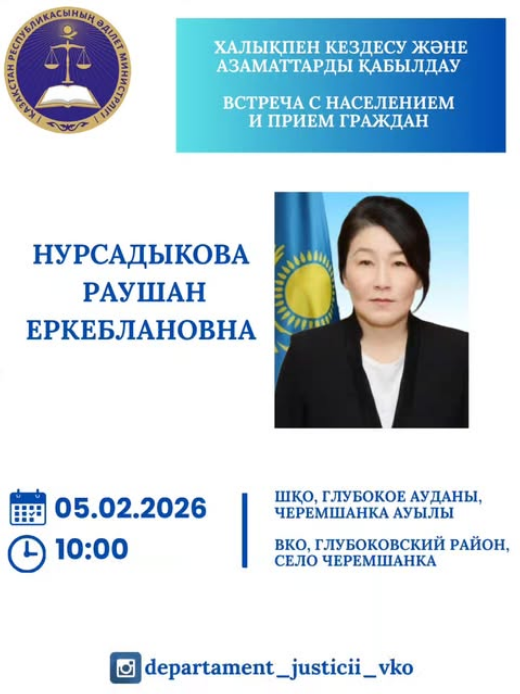 05 февраля текущего года руководителем отдела по праворазъяснительной работе и оказанию юридических услуг Департамента юстиции Восточно-Казахстанской области Р.Нурсадыковой будет проведена встреча с населением Глубоковского района: