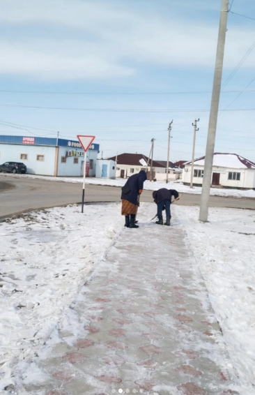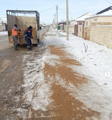В Кызылтобинском сельском округе продолжается расчистка от снега и льда пешеходных дорожек.
