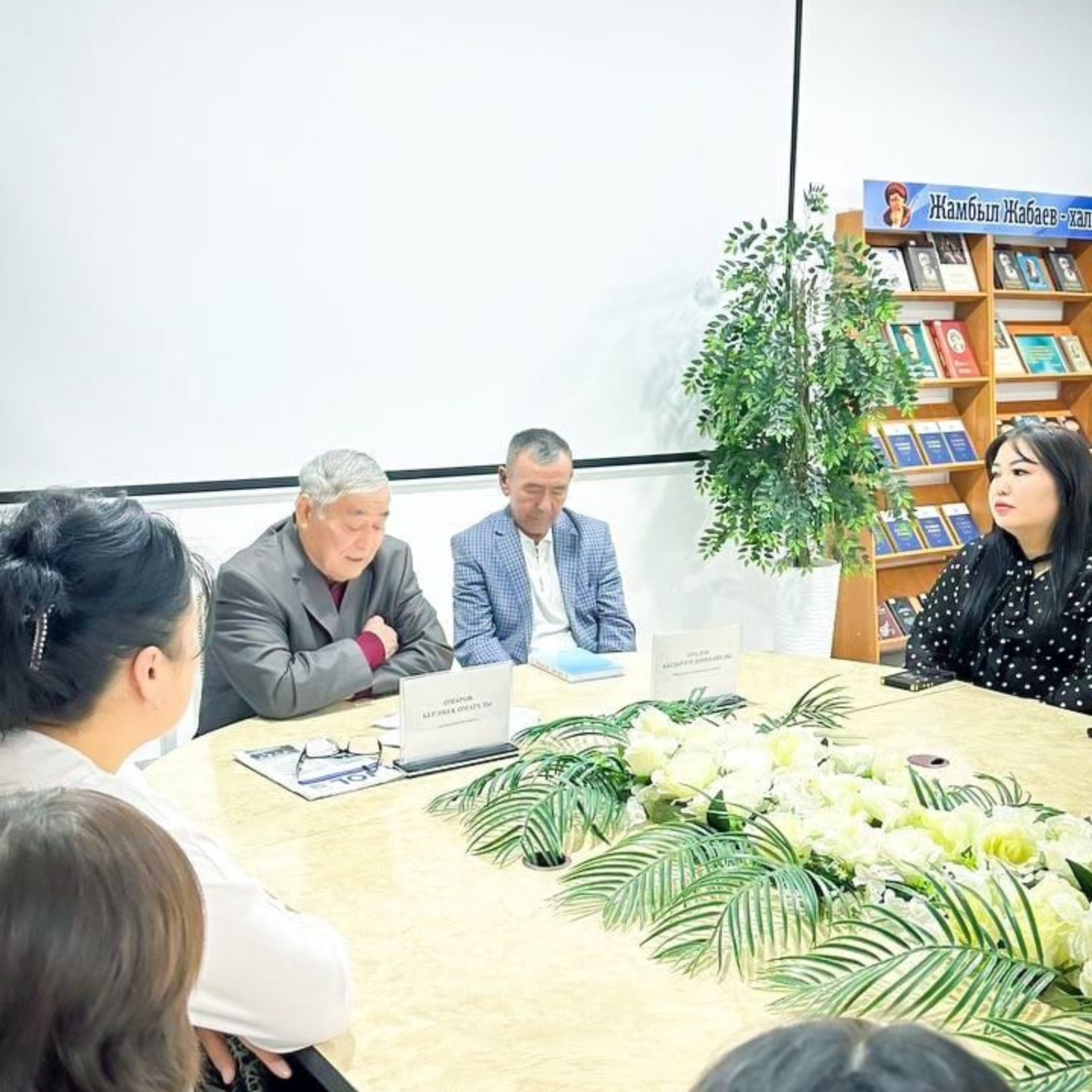 Сегодня в районной библиотеке села Сарыкемер состоялась встреча с коллективом учреждения. Во встрече приняли участие председатель районного совета ветеранов Бердибек Омаров, поэт-композитор, методист районного Дома культуры Каскырбай Нарбатыр.