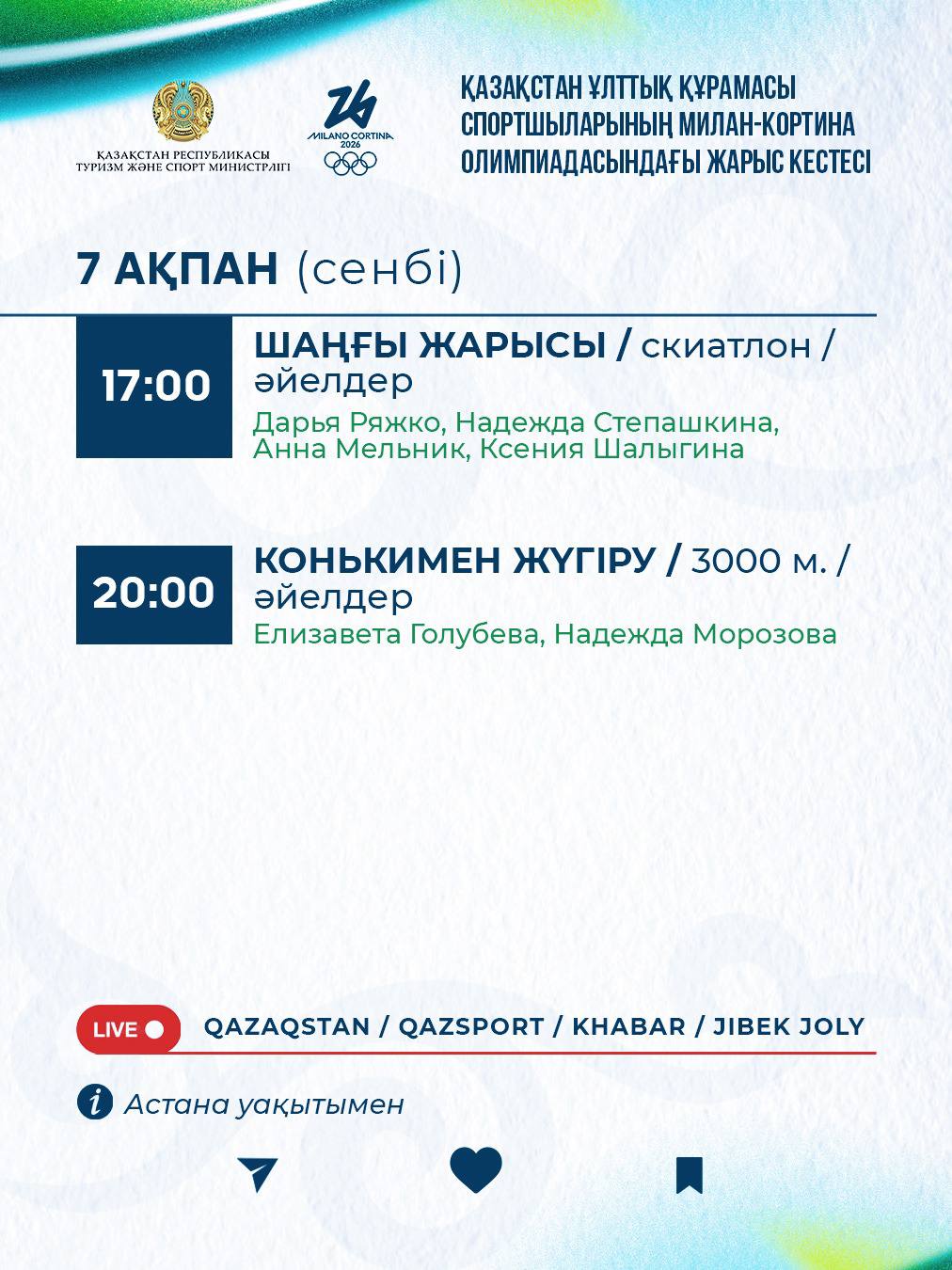 7 февраля стартует Олимпиада Милан–Кортина. В первый соревновательный день шесть спортсменов из Казахстана выступят в двух видах спорта.