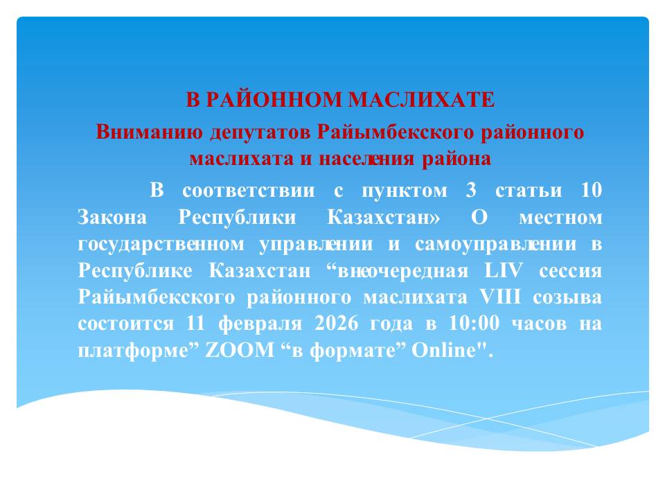В соответствии с пунктом 3 статьи 10 Закона Республики Казахстан» О местном государственном управлении и самоуправлении в Республике Казахстан “внеочередная LIV сессия Райымбекского районного маслихата VIII созыва состоится 11 февраля 2026 года в 10:00 часов на платформе” ZOOM “в формате” Online”.