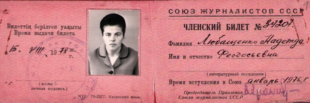 26 июня 2021 году Любащенко Надежду Феодасьевну награждают нагрудным знаком Министерства информации и общественного развития Республики Казахстан «Ақпарат саласының үздігі», это награда знак признания её многолетнего результативного труда, верности своей профессии  длинною в жизнь.