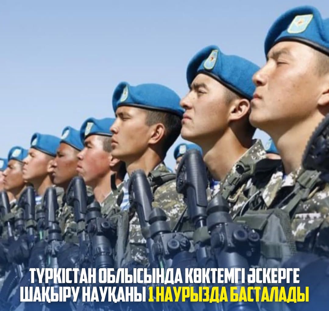 Весенняя призывная кампания граждан в возрасте от 18 до 27 лет в Туркестанской области начнется с 1 марта 2026 года. В этом году планируется пополнение Вооруженных сил и других воинских формирований более чем 3 тысячами призывников из Туркестанской области.